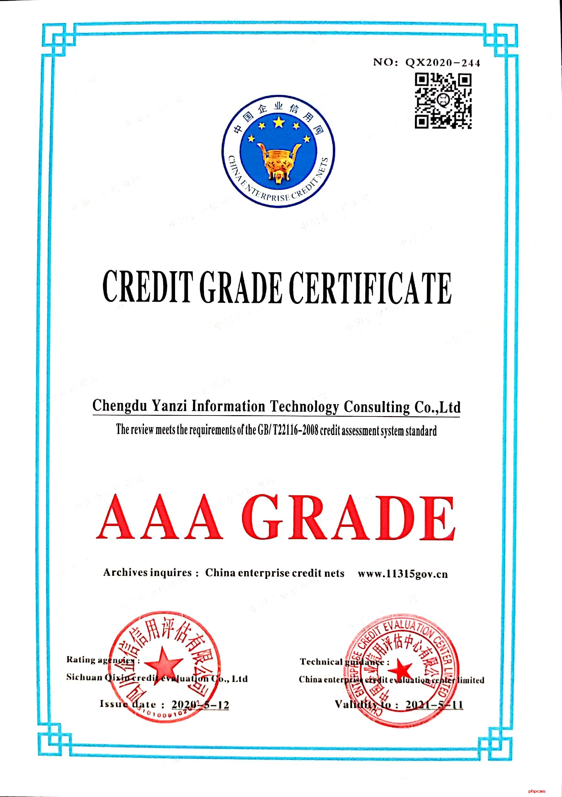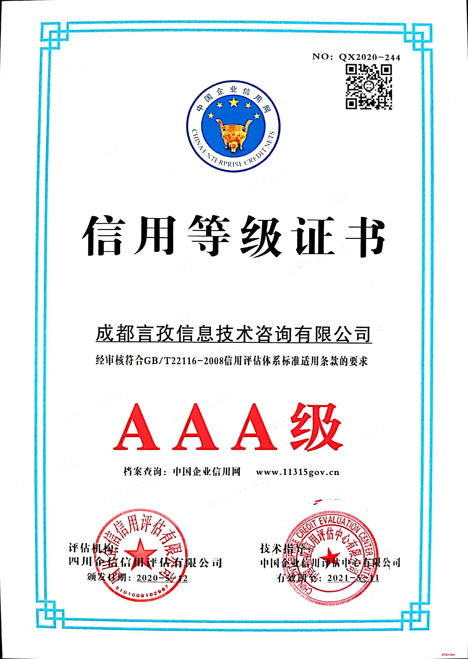 2020年5月12日,經(jīng)過(guò)征信調查和綜合評價,成(chéng)都(dōu)言孜信息技術咨詢有限公司榮獲AAA信用等級證書。這(zhè)代表著(zhe)我公司的商業信譽和優質的服務水準再次獲得了第三方權威機構的認可。